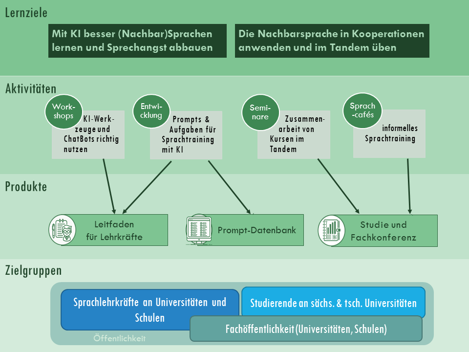 Mit dem Projekt werden die Zusammenarbeit und Begegnung deutscher und tschechischer Studierender systematisch gefördert und neue KI-gestützte Aufgabenformate in universitäre Sprachlehrangebote curricular integriert. Das geschieht auf drei Ebenen: